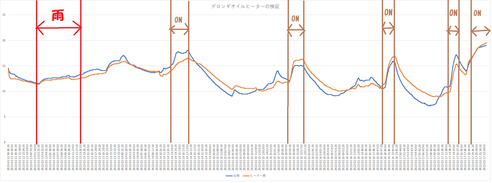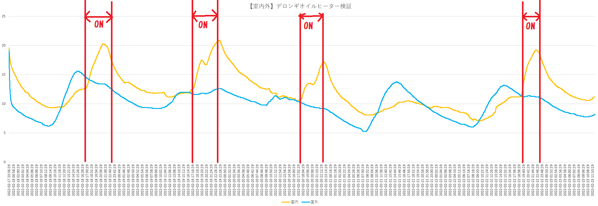 1番目と2番目の「ON」時の最高室温が20度を超えています。